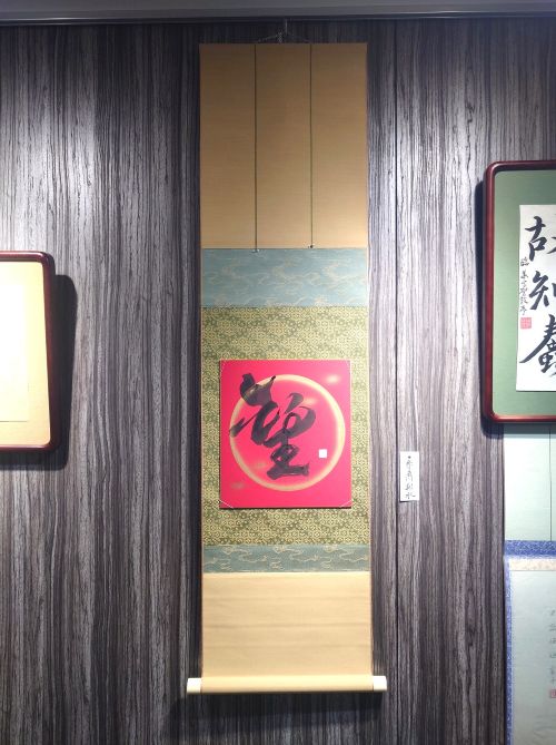美しい朱色の掛け軸は和服の帯をリメイクして仕立てられたそうです。